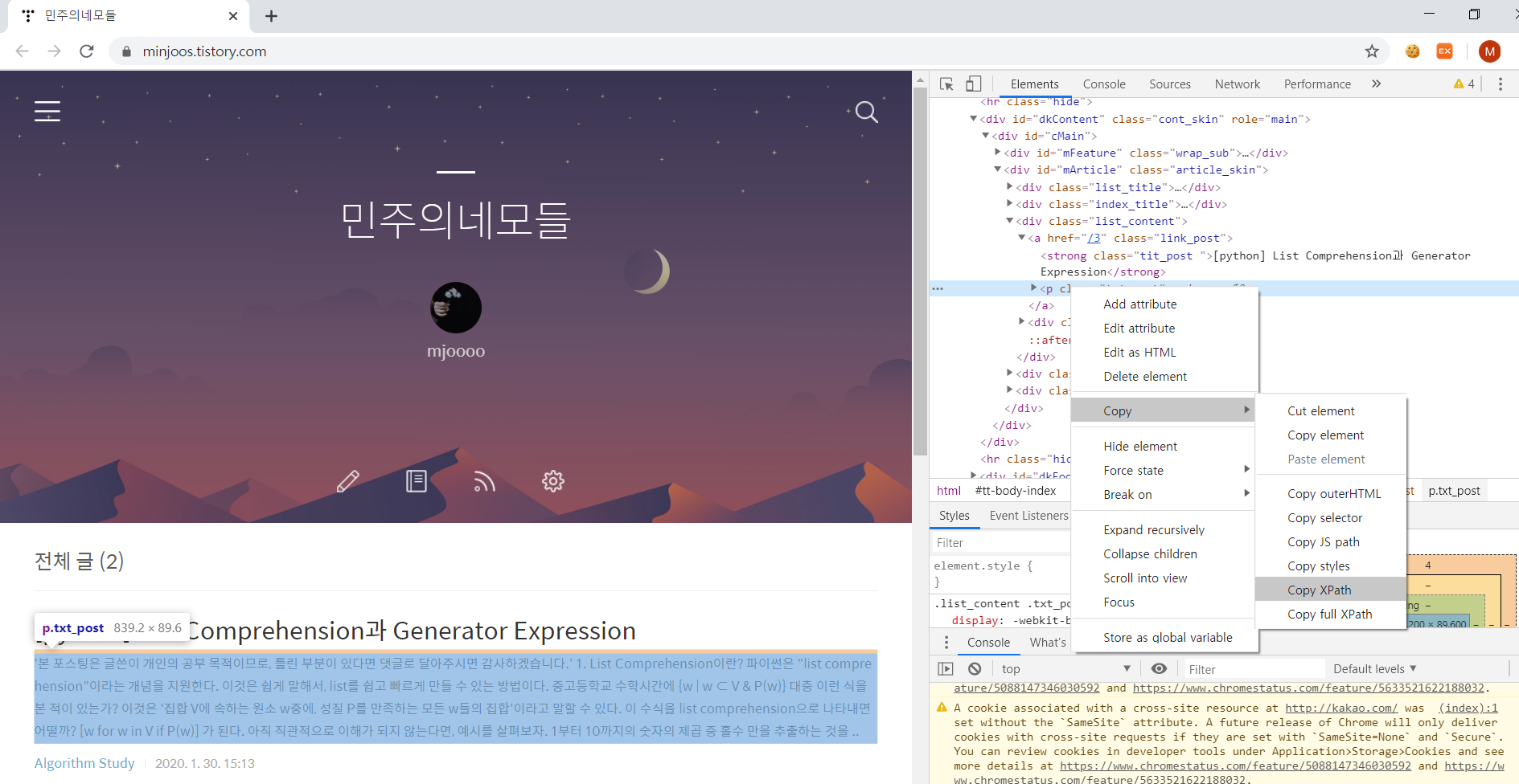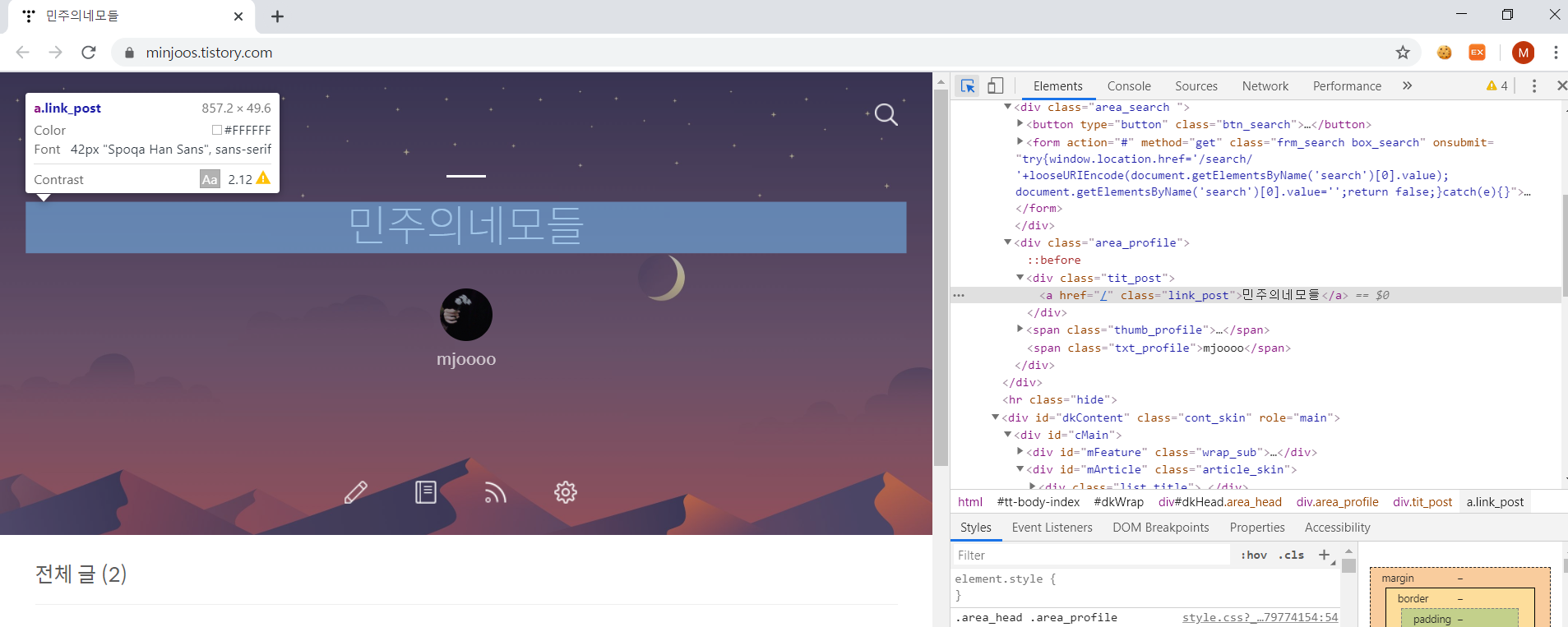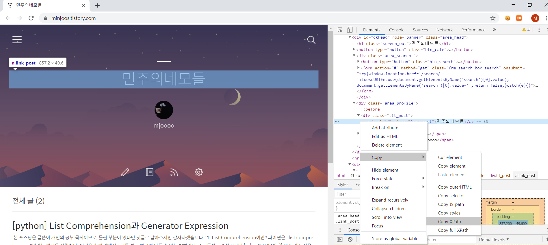 위 사진의 개발자도구 창을 보면 '민주의네모들'에 해당하는 위치의 class 이름이 "tit_post"임을 확인할 수 있다.