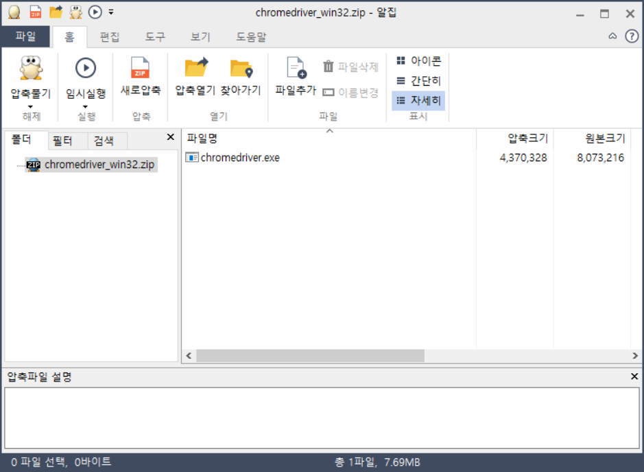그렇게 해서 다운로드 받은 알집 파일의 압축을 풀면 chromedriver.exe 파일이 나온다.