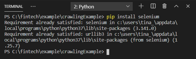 그리고 selenium을 설치해야 하는데, 늘 그렇듯 터미널에서 pip 명령어로 다운받아 준다.