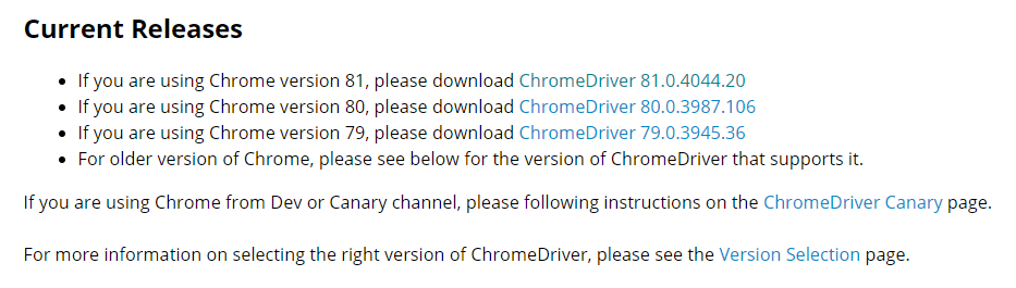 여기서 chromedrvier를 다운받을 수 있는데 여기서 주의해야 할 점은,