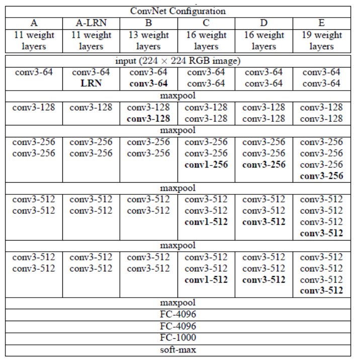 VGG 연구팀은 총 6개의 구조(A, A-LRN, B, C, D, E)를 만들어 성능을 비교했다.