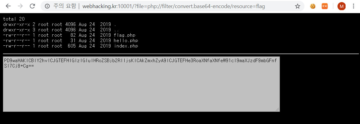 따라서 우리는 url에 php://filter/convert.base64-encode/resource=flag 를 덧붙혀준 뒤,