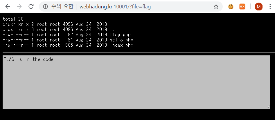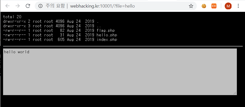 여기서 유심히 봐야할 것은 url이다. file=hello 라고 되어있는데 이를 보아하니 1. GET 방식으로 파일명을 받아오는 것 같다. 회색 창에는 hello world 라고 쓰여있는데 이는 hello.php라는 2. 파일이 회색 창에 출력되는 것이라고 유추할 수 있다. 또한 정확한 파일명은 hello.php인데 url 주소창에는 hello만 적혀 있으므로,