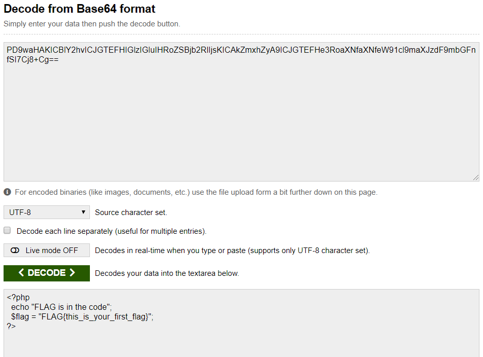 base64로 인코딩된 flag.php 소스코드 (출력값) 을 디코딩하여 소스코드를 알아낼 수 있다!